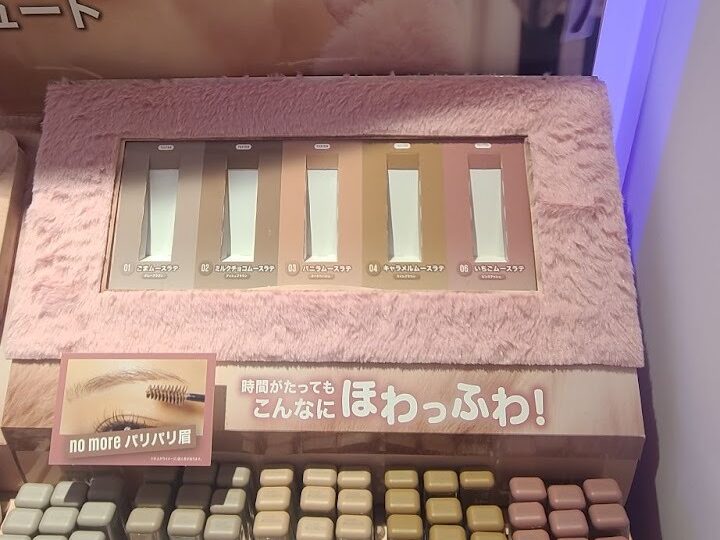 私が特に注目したポイントはコチラです!テスター部分にほわっふわな生地が貼り付けられています。モデルさんの衣装や土台部分など、いたるところにピンク色のほわっふわな生地が使用されていますが、画像だけでなく、実際の生地を貼ることで立体感とほわっふわな質感を表現しています。一般的な眉毛マスカラは時間が経つとパリパリになってしまうイメージがありますが、メイベリン商品の「時間が経ってもほわっふわ眉」というアピールポイントを伝えています。