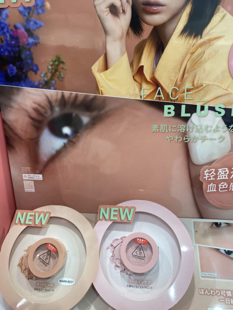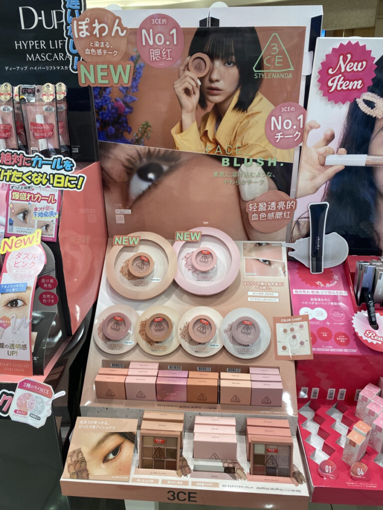 こちらは3CEのフェイスブラッシュと、マルチアイカラーパレットのフロア什器です。